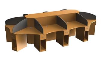 10-Person Study Booth Workstation With Screens - the main carcase is manufactured from sturdy 18mm MFC, with 25mm desktops including cable management ports, PC cabinets with top locking drawer, and coloured MFC dividing screens. Suitable for schools, colleges, offices, and for commercial environments such as call centre working. The open PC cabinets can be converted to have a lockable cupboard door with top drawer, instead of open unit with top drawer (see Optional Extras). The open PC cabinets can also be converted to 3-drawer units (see Optional Extras). The workstations and the screens are available in a range of MFC finish colours. Screens can be converted to fabric screens of the same colour as the MFC selected (see Optional Extras).