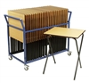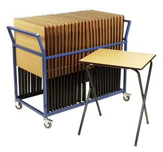 100 Folding Exam Tables + 4 Trolleys, is an excellent value package for the school, college, university, and other education centres, with the trolley providing convenient storage and easy movement for when the tables are required come exam time. The wooden exam desk top comes with a pen groove and has a strong round steel frame, which will fold neatly away onto the trolley when not in use. The trolley comes in a choice of 4 colours and has brake loaded castors for safe movement around the school.