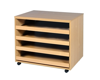 Beech or Maple 4 sliding drawer open paper storage unit for multiple uses in the school. This robust wooden storage unit is ideal for the school classroom, artroom, office, or other storage areas in the school. A compact and convenient open filing storage unit that will fit well in the school environment. The unit comes fully assembled and with castors.