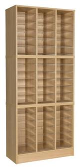 54 Shelf Pigeon Hole Unit, ideal for sorting post and distributing mail, with 54 pigeon hole spaces. This robust unit is ideal for school classrooms, for staff rooms, reception areas, for the office or for post room storage. A fantastic letter sorter for the mailroom which can also be used to store stationery, paperwork, etc. Each pigeon hole shelving unit comes fully assembled, and has a durable, wipe-clean, laminate finish available in 5 colours - beech, maple, oak, grey & white. All shelves are preset but are fully adjustable with 32mm hole spacings to create different size openings. The clear acrylic shelves come complete with a label holder for the front. These units are solid & heavy and have been designed as modular units which simply connect together.
