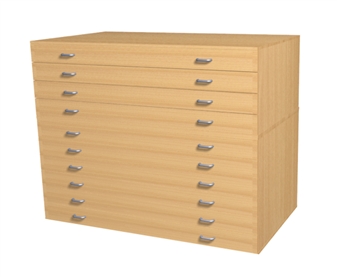 A1 10 Drawer Plans Chest, ideal for the art room, workshop, and other storage areas. This professional quality wooden storage unit is ideal for the school classroom, art room, office, or other storage areas in the school. Built to house artwork, large plans, and other work up to A1 size. An attractive filing storage unit that will fit well in the school environment. The unit comprises a 4-drawer unit on top of a 6-drawer unit and simply bracketed together. The finish is manufactured in a scratch resistant, wipe clean laminate, and the drawers with metal runners. It comes with the option of 5 wood finishes - beech,maple,oak,grey & white.