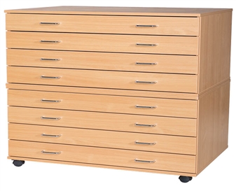 Mobile 8 Drawer A1 Plans Chest ideal for the art room, workshop, and other storage areas. This professional quality wooden storage unit is ideal for the school classroom, art room, office, or other storage areas in the school. Built to house artwork, large plans, and other work up to A1 size. An attractive filing storage unit that will fit well in the school environment. The unit comes fully assembled and is manufactured in a scratch resistant, wipe clean laminate, and the drawers come with metal runners. It comes with the option of 5 wood finishes - beech, maple, oak grey or white. Static unit without wheels also available.