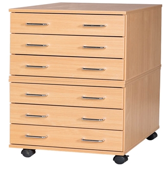 Mobile 6 Drawer A2 Plans Chest ideal for the art room, workshop, and other storage areas. This professional quality wooden storage unit is ideal for the school classroom, art room, office, or other storage areas in the school. Built to house artwork, large plans, and other work up to A2 size. An attractive filing storage unit that will fit well in the school environment. The unit comes fully assembled and is manufactured in a scratch resistant, wipe clean laminate, and the drawers come with metal runners. It comes with the option of 5 wood finishes - beech, maple, oak, grey or white. Static unit without wheels now also available.
