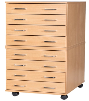 Mobile 8 Drawer A2 Plans Chest ideal for the art room, workshop, and other storage areas. This professional quality wooden storage unit is ideal for the school classroom, art room, office, or other storage areas in the school. Built to house artwork, large plans, and other work up to A2 size. An attractive filing storage unit that will fit well in the school environment. The unit comes fully assembled and is manufactured in a scratch resistant, wipe clean laminate, and the drawers come with metal runners. It comes with the option of 5 wood finishes - beech, maple, oak, grey or white. Static unit without wheels now also available.