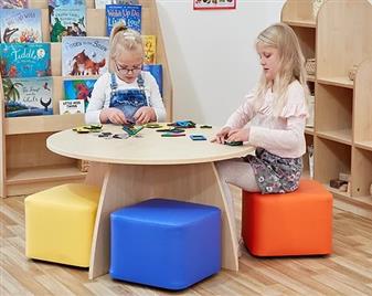 Activity & Reading Table with 4 soft seats upholstered in an anti-bacterial wipe clean vinyl perfect for any early years setting. Encourages group work & collaboration and is perfect for a reading table in a library setting or as a activity table in a nursey school or play school setting. The tables come with 4 dot seats or 4 cube seats and are available in 7 bright colours and you can choose to have them all in one colour or mix and match colours - if the colour options are not on please contact the office for your colour choices. Dot Or Cube Seat Height - 250mm & 350mm diameter.