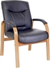 Black Leather Faced Executive Chair upholstered with supple faux leather, and with light oak colour wooden arms and base, and matching padded arm covers. The chair features a gas seat height adjustment and reclining function with adjustable tension control. Ideal seating for the office, or for other working areas.