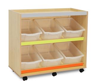 Bubblegum Angled Tray Unit with 6 translucent deep trays. This robust wooden library unit is ideal for the primary school classroom or other library areas in schools where a mobile trolley can fit, so that it can be moved easily if required. Compact and convenient, the unit comes fully assembed and with castors. Available in maple finish and with coloured edges in a choice of lime, grey, tangerine, white, and raspberry. 5 year manufacturer guarantee.