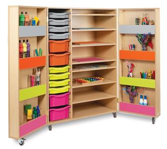 Bubblegum Art Cupboard is a colourful and fun way to keep all your art stored away in a easy to see storage cupboard. They are available with all four colour trims and and wood finish is in Maple. The units come complete with Monarch trays, 8 single, 4 double and come in the four colours shown to match the inside trim colours. Complimentary range of colourful storage, cloakroom units and library furniture available to match.