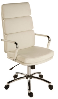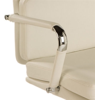 Retro Eames style chair upholstered with supple faux leather and soft sit cushions, in white. The chair features a gas seat height adjustment and reclining function with adjustable tension control. It comes finished with bright chrome armrests and additional removeable arm covers. Ideal seating for the office, or for other working areas.