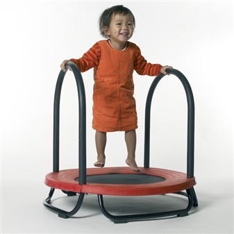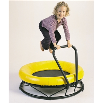 Junior trampoline with High-Foam Cushion. Functionally correct and beautifully designed toy for children. Probably the most beautiful and most suitable trampoline ever seen in the child-care sector. The sloped protective cushion with high rear edge (11 cm) yields utmost protection during play. Foam-covered handle is included. Reinforced springsheet suspended in steel springs. Welded steel construction.