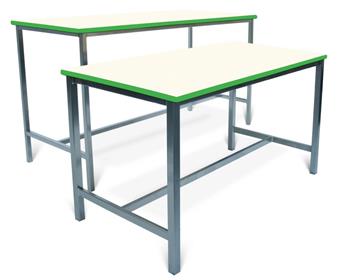 H-Frame craft or science tables with chunky 40mm square tube frame, and PVC edge. These tables provide high work tops and can be used in art and craft rooms, science labs, food tech environments, design studios etc. The square tube frame can come in a range of colours, and the table top comes in a choice of several laminate top finish colours. Available in 5 different heights.