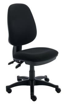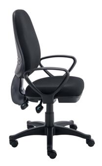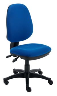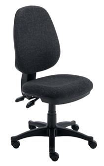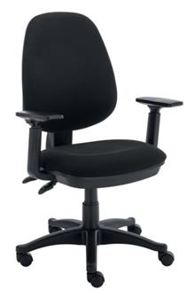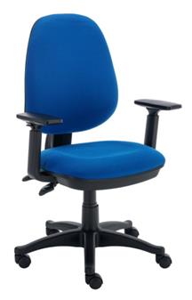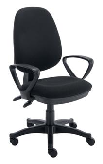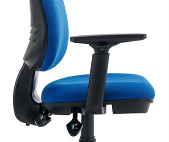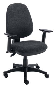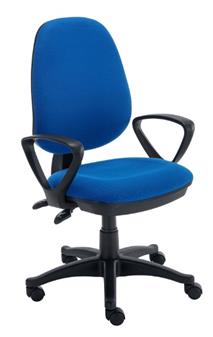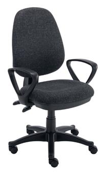 on castors, with twin lever - (gas-lift and back-tilt). The chair has a deep cushioned back and seat, with waterfall front design seat. Ideal seating for the school classroom, computer room, or other education environments. Available in black, charcoal or blue fabric upholstery. The chair comes with no arms, with fixed loop arms, or with height-adjustable arms. 2 year manufacturer's guarantee.