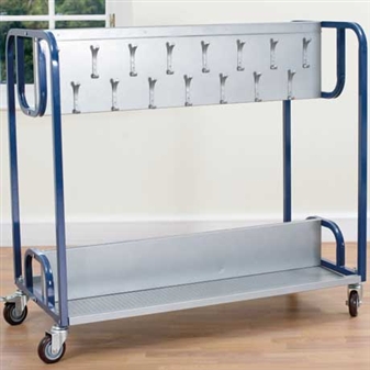Classroom Cloakroom Trolley with large base storage shelf, ideal for shoes and bags with a centre divide. It comes with 15 double coat/bag hooks each side allowing storage of up to 30 coats. Ideal for the nursery school, pre-school, play school, early years classroom, primary school, and other children's educational environments.