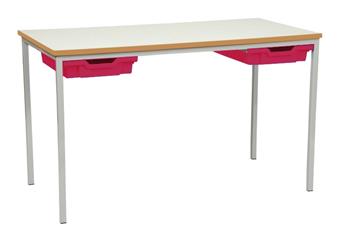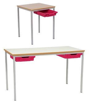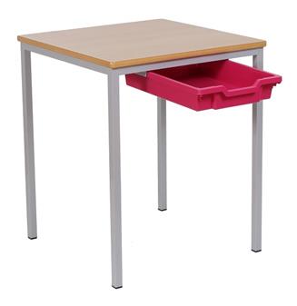 Classroom Tables With Tray Drawers - MDF Edge - square and rectangular fully-welded classroom tables with laminated top and plastic tray(s) on runners underneath the table. Ideal table or desk for either primary school (choose 1100w x 550d rectangular tables), or secondary school (choose 1200w x 600d rectangular tables), and for other educational and learning environments. Available in 6 heights, these tables are used throughout school classrooms in the UK. The steel frame is available in a choice of several different Epoxy powder coated frame colours. UK manufactured and comes with a 5 year guarantee. Minimum Order 6 Tables - if you require les than 6 please contact the office for a price. (For associated tables with matching frame and edge type, see Related Products.)
