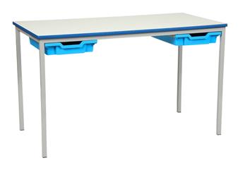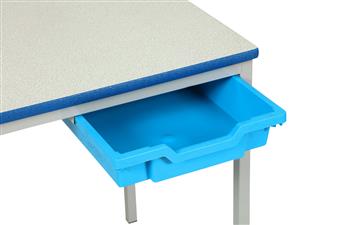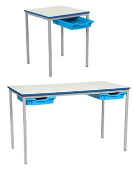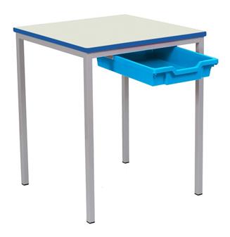 Classroom Tables With Tray Drawers - PU Edge - square and rectangular fully-welded classroom tables with laminated top and plastic tray(s) on runners underneath the table. Ideal table or desk for either primary school (choose 1100w x 550d rectangular tables), or secondary school (choose 1200w x 600d rectangular tables), and for other educational and learning environments. Available in 6 heights, these tables are used throughout school classrooms in the UK. The steel frame is available in a choice of several different Epoxy powder coated frame colours. UK manufactured and comes with a 5 year guarantee. Minimum Order 6 Tables - if you require les than 6 please contact the office for a price. (For associated tables with matching frame and edge type, see Related Products.)