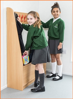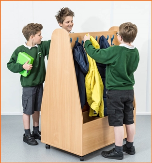 Cloakroom Stations, single or double-sided, including bottom storage bays and with 8 or 16 unbreakable coathooks (in a choice of 6 colours). (Multicolour coat hooks are supplied as a random selection of colours.) These robust units make ideal furniture for school cloakroom areas. The Single unit is a static cloakroom station, while the Double unit is mobile, and each comes in 2 different heights - one suitable for under 8 years old and the other over 8 years old. Each unit comes fully assembled, and is available in a durable, wipe-clean, scratch resistant laminate finish in a choice of 5 wood finishes - beech, maple, oak, grey & white.