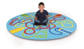 Vibrantly coloured 2 x 2m highly attractive circular decorative carpet. Designed to create an exciting area for group teaching and reading activities. Great and functional hardwearing carpets to brighten up any classroom environment. Ideal for nursery school, pre-school, play school, and early years and recommended for soft reading/play areas. The carpet has a safe anti-slip backing, tightly bound edges to prevent fraying, a high quality soft textured tufted pile for comfort and durability, and meets all relevant safety and fire standards.