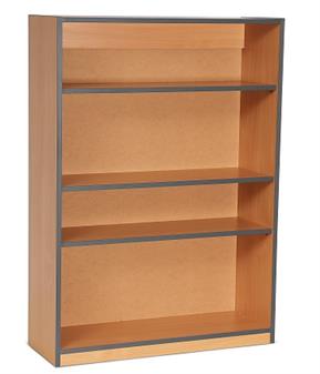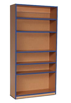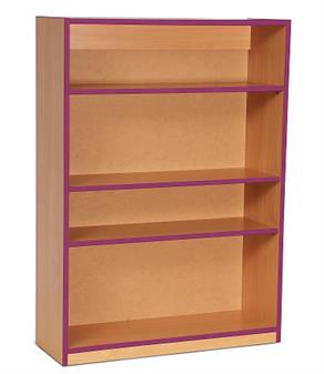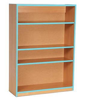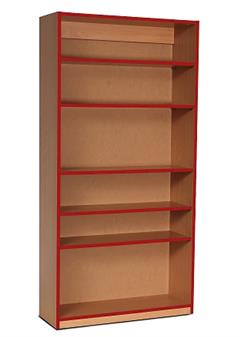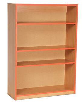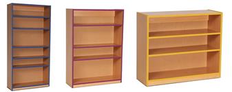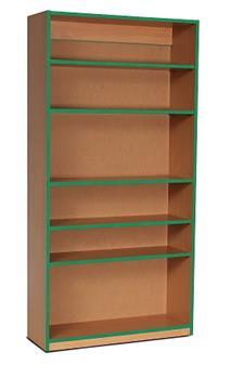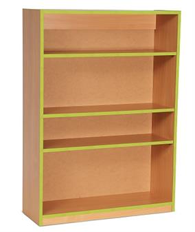 Ready assembled wooden open bookcases, 900mm wide, in 3 different heights, with a choice of red, green, blue, yellow, cyan, purple, tangerine, lime, grey & steel blue edging. Suitable for the school classroom, office, or storage room. The bookcases have differing numbers of adjustable shelves according to their height. Ideal for book/folder storage in the school classroom or school offices. The bookcase comes in a beech or maple finish with a choice of 10 edge colours. Supplied fully assembled.