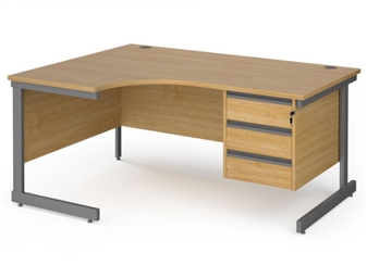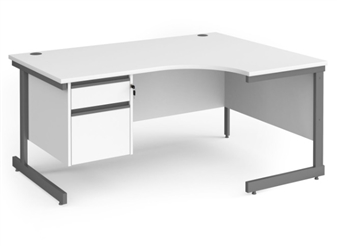 Contract C-Frame Radial Desks With Fixed Drawers. Ideal in a school classroom, as a teacher's desk, in the office, or as classroom/computer desks. The desks have 25mm worktops, modesty panels, attractive C-frame cantilever design legs in graphite grey, port holes for computer cabling, and height adjustable feet. The drawer units come with full-width finger-pull handles, and are fully locking. The drawer units come as 2 or 3-drawer pedestals, with the 2-drawer pedestal containing a filing drawer which accepts both A4 and foolscap files. The desks come in beech, oak or white, and in 2 sizes - 1600 and 1800mm, both as left-hand and right-hand returns. This range comes with an 8 year guarantee.