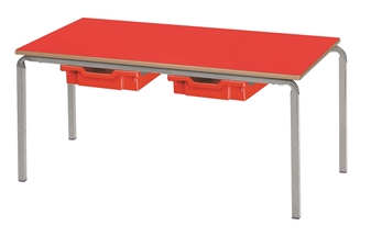 Crushed-bent rectangular classroom tables wih plastic trays on runners. The table comes with a hardwearing 18mm MDF laminated top, which is available in a range of laminate finishes. The trays create convenient under desk storage, an come in a choice of colours. This table/desk will suit any school classroom, or other educational and learning environment. The table comes with a rounded bullnose MDF edge. It has a sturdy steel frame which comes in a choice of 4 different frame colours. Available in 6 heights to suit ages 3 through to adult (see below).