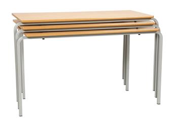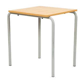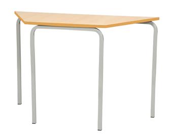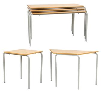Crushed Bent Classroom Tables - MDF Edge, with robust 25mm fully welded square section frame, which is bent in manufacture, to create rounded leg frames which are shorter on one side enabling you to stack tables with ease. 18mm thickness tops come laminated in a range of colours. Available as square, and rectangular or trapezoid (1100 x 550 - primary or 1200 x 600 - secondary), and in 6 heights, these tables are used throughout school classrooms in the UK. The steel frame is available in a choice of several different Epoxy powder coated frame colours. Tables stack to a recommended 6 high. UK manufactured and come with a 5 year guarantee.