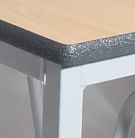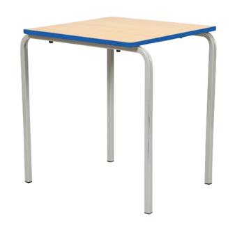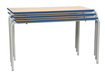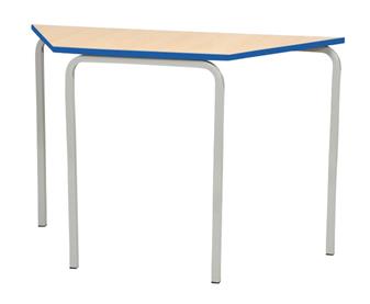 Crushed Bent Classroom Tables - PU Edge, with robust 25mm fully welded square section frame, which is bent in manufacture, to create rounded leg frames which are shorter on one side enabling you to stack tables with ease. 18mm thickness tops come laminated in a range of colours, and there are a choice of 3 PU edge colours. Available as square, and rectangular or trapezoid (1100 x 550 - primary or 1200 x 600 - secondary), and in 6 heights, these tables are used throughout school classrooms in the UK. The steel frame is available in a choice of several different Epoxy powder coated frame colours. Tables stack to a recommended 6 high. UK manufactured and come with a 5 year guarantee.