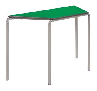 Crushed-bent framed trapezoidal classroom tables with a hardwearing 18mm MDF laminated top, which comes in a range of laminate finishes. Available in 6 heights to suit ages 3 through to adult (see below). This table/desk comes in 2 sizes, and will suit any school classroom, or other educational and learning environment. The table comes with a Duraform PU edge in a choice of colours, and on a sturdy steel frame which comes in a choice of 4 different frame colours. (For associated tables with matching frame and edge type, see Related Products.)