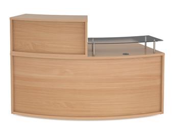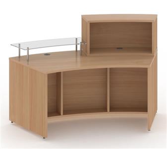 Curved Reception Desk for school or office reception areas, with a 45 degree curved base unit, 45 degree curved top unit, and curved glass shelf glass shelf. The desk comes in beech with surfaces that are scratch and heat resistant, and the desktop comes with cable access ports. The top hutch unit and glass shelf can be fitted on either the right or left hand side. The reception unit is supplied flat-packed for easy self-assembly.