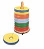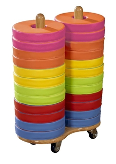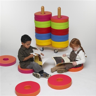 Wooden seat trolley carrying 24 bi-colour Donut Cushions. Suitable for nursery school, pre-school, play school, primary school, and early years, this wipe-clean vinyl furniture will bring added colour and space-saving convenience to any school classroom. The multi-cushion trolley carries convenient seating for group reading/teaching activities, allowing easy and mobile out-of-the-way storage when not in use. The handmade solid wood trolley is made from hardwood selected from sustainable forests, and the cushions are made from high quality, durable, wipe-clean vinyl, double stitched for strength, and the trolley and cushions meet all the relevant safety standards.