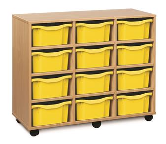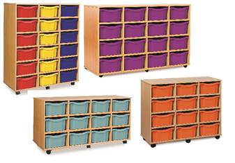Fully assembled wooden beech or maple tray storage units to take from 12 up to 18 Monarch Double plastic trays. These mobile units are suited to school, classroom, and other educational environments, and may also be used at home, in the office, or in other workshop settings. The units are available in the full range of plastic tray colours. Or order a combination of red, blue, green and yellow trays (see below).