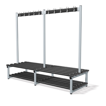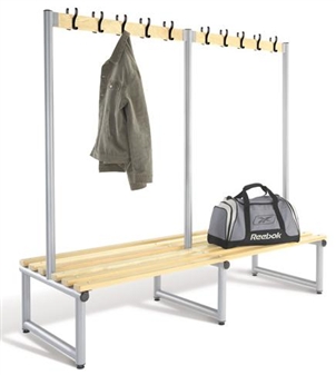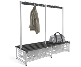 Double Sided Coat Hook Bench for the cloakroom or changing room, offering a robust and attractive solution for cloakrooms in a variety of settings. Ideal for school changing room areas, sports hall and gym changing, and fitting a variety of educational and leisure cloakroom needs. The virtually unbreakable polymer coat hooks have been ergonomically shaped, and contain anti-bacterial elements, effective against MRSA. They come in a choice of 5 colours. The double sided bench comes in a choice of 3 lengths & 3 Heights and with standard floor fitting anchors. It comes with a robust 50mm round, thick wall tubing frame with welded joints, which comes in a choice of 7 colours. The slats come in solid timber (Ash), or as black food grade polymer slats, containing high performance anti-bacterial elements, (which are effective against MRSA). There are optional extras including base shelf slats for further off-floor storage, and also optional shoe/storage baskets, single compartment or twin compartment, which can be supplied for under bench storage. The benches come with a 5 year guarantee.