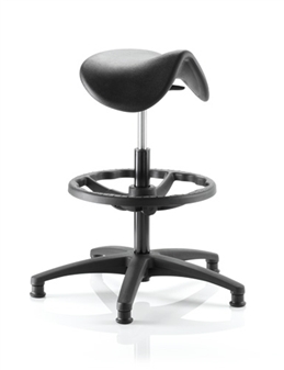 Draughtsman Saddle Seat - Soft PU, on glides with a gas-lift height adjustment and adjustable footring, and made with a soft polyurethane seat. Ideal seat for a variety of working environments including the school lab, hospital, clinic, doctor's surgery, or in craft and science or research classrooms. The soft PU saddle seat is easy to wipe clean. Guarantee 5 years.