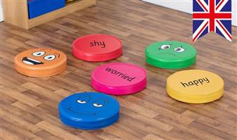 Pack of 6 emotion cushions with multi curricular applications. Suitable for nursery school, pre-school, play school, and early years. Children can have fun learning personal, social, and health education. Also useable as wipe clean story cushions. Made with brightly coloured, soft touch, wipe clean vinyls. The cushions are made to exacting quality standards and the foam and vinyls meet all the relevant safety and fire standards.