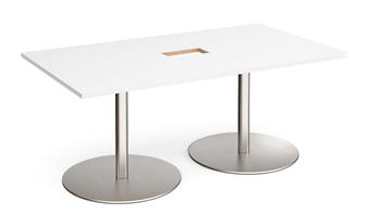 Eternal Rectangular Boardroom Tables - Power Ready - for meeting or breakout areas, or suitable as a canteen table, is a robust meeting table with a stylish flat double circular base available in brushed steel frame and a white top, with cutouts for integrated power. Perfect for a wide variety of uses in a number of different environments. The table comes with cutout, and the power module and mains lead needs to be purchased seperately. 2 year manufacturer guarantee.