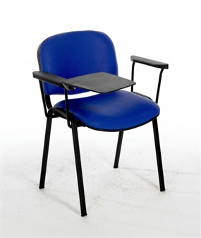 Stacking vinyl reception chair with black frame, two arms & writing tablet, available in a range of vinyl colours. An ideal exam or study chair with folding writing tablet. Writing tablets are available as right-handed or left-handed but are not interchangeable. The standard vinyls are wipeable, and washable with a damp cloth and warm water. The vinyl has a low hazard rating, and conforms to the BS5852 Standard cigarette and match tests. The vinyls are available in selection of popular colours. (Other vinyl colours are available on request and for an extra charge. Please call the office to enquire further.) The chairs will stack with the tablet folded down and are recommended to stack 4-5 high. Weight Limit 20 Stone. Minimum Order 4 Chairs