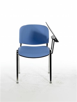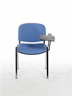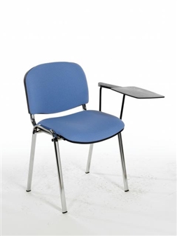 Stacking reception or lecture chair with chrome frame, one arm & writing tablet, and available in a wide range of colours. An ideal exam chair or student study chair with folding writing tablet. Writing tablets are available as right-handed or left-handed but are not interchangeable. The chairs will stack with the tablet folded down and are recommended to stack 4-5 high. Minimum order 5 chairs in this range.