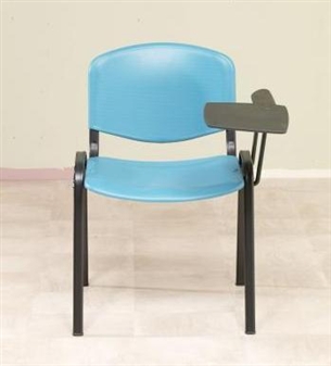 Stacking plastic reception or lecture chair with black frame, one arm & writing tablet, and available in a blue, green, red, or black seat. An ideal exam chair or student study chair with folding writing tablet. Writing tablets are available as right-handed or left-handed but are not interchangeable. The chairs will stack with the tablet folded down and are recommended to stack 4-5 high. Minimum order 5 chairs in this range.