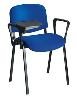 Next day delivery fabric chairs with black frame and two arms, and fixed universal writing tablet which can fit onto either the left or right arm by means of a simple screw and allen key adjustment. Suitable for conference rooms, the meeting room, school lecture room, training room etc.. and available in a choice of royal blue, black, red, claret, green or charcoal fabric. The writing tablet is folding for convenient storage. A robust chair available at short notice with next day delivery. Minimum Order 4 Chairs