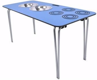 The Mud Kitchen is a lightweight folding table suitable for use indoors and outdoors and supplied with two stainless steel bowls, four hob rings, a convenient carry handle and a durable top. Suitable for early years play - playschools, nursery schools or primary school. The folding Mud Kitchen offers far more flexibility than traditional designs, it has an aluminium frame and is very lightweight. The composite top is ultra-tough and with an inbuilt UV colour fix, can be left outside all year round and is available in three colours - Azure, Pea Green & Warm Grey. The folding kitchen is backed by a 5-year guarantee and can be packed flat in seconds, making it the ideal choice when space is at a premium