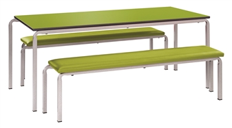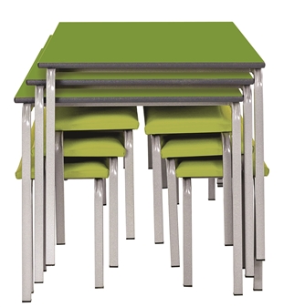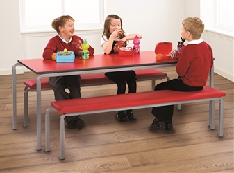 Gala Dining Tables & Benches, available in infant and junior sizes, encouraging communal dining, and offering a fantastic classroom solution to fit sets of tables and benches together - a stack of 3 tables and 6 benches (which will accomodate 18 pupils) can stack together in one group. The tables come with solid 18mm MDF tops with high pressure laminate in a choice of 2 bright top colours and with a Duraform spray PU edging available in 5 colours. Each table and bench has a sturdy 30mm crushed bent steel frame which comes in a choice of 4 different frame colours. The benches are upholstered in a choice of 2 vinyl colours. 5 year manufacturer's guarantee.