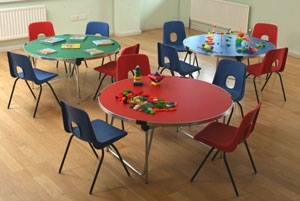 These robust round folding tables are available in a choice of 20 attractive wipe-clean laminate top colours and in six different heights. They are a popular choice for school dining and pre-school activities but work equally well for meetings and banqueting.