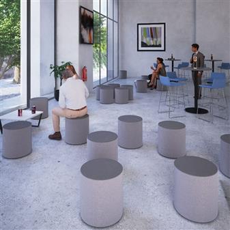 Groove Round Soft Seating upholstered in dual tone fabrics - Camira Era Forecast Grey Base & Camira Era Present Grey Top. These seats can be used on their own, around a coffee table for a relaxed seating area or mix with other seating ranges (see related products) to add interest to any reception area, breakout area or in libraries. Available on a quick ship delivery of 3-5 working days from order.