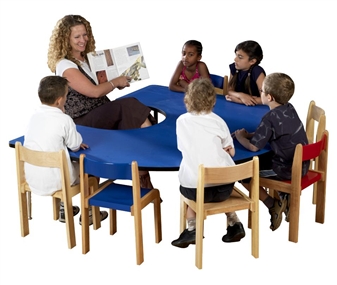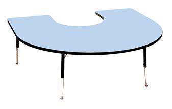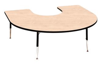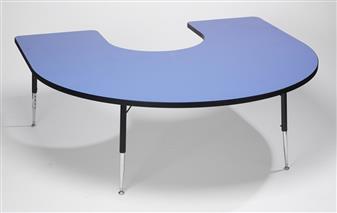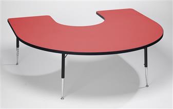 Premium quality height-adjustable Horseshoe table, with shaped top to help facilitate creative interaction. This piece of classromm furniture is ideal for the nursery school, pre-school, play school, early years classroom, primary school, and other children's educational environments. Hardwearing and wipe-clean, the table is designed for longevity and is ideal for heavy-duty educational usage. It comes in four laminate top colours; red, blue, maple & grey each with a durable PVC moulded edge for added safety, and the frames are black powder coated (EPC) for scratch resistance and longevity. The table has adjustable heights in 25mm increments, starting from 430mm up to 635mm high, and requires simple assembly.