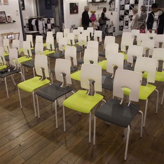 Hille SE Ergonomic Chair, used widely in schools, colleges, and other educational and multi-seating environments. The build of this polypropylene chair was designed to fit in with the stylish image demanded by schools and as a chair that gives excellent postural qualities and is built to last. The SE Chair is ergonomically designed to reduce backward pelvic rotation, thus maintaining balance in the lower spine, and giving pelvic, lumbar, and thoracic support. This ergonomic stacking chair is UK manufactured using high tensile steel frames and virgin polypropylene to ensure their durability in classroom environments. There are 8 chair colour options for shells, and 3 frame colour options. The chair is lightweight and comes with a handhole in the back. The SE Chair is recommended for stacking up to 8 high. The chair complies to BS EN1729 standards and comes with a 10 year guarantee. Weight Bearing to 21 stone.