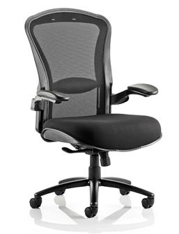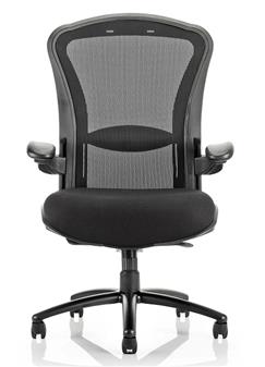 Houston Heavy Duty Operator Chair designed and engineered for 24 hour heavy duty use, with a black mesh back and black fabric. The chair has extra large dimensions and deep upholstery with a weight tolerance of 32 stone (205kg). Features include adjustable lumbar support, gas height adjustment, anti-shock fully synchronous tilting action, tilt tension control, synchronised tilt mechanism and height adjustable armrest with large padded arms.