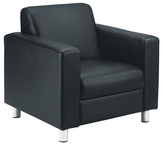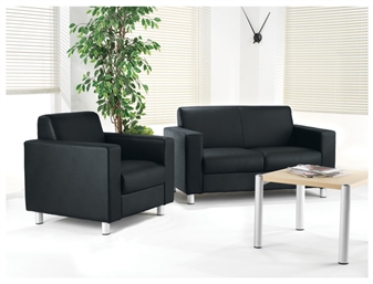 Iceberg Leather Reception Chairs, available for next day delivery. 1-seater armchair and 2-seater sofa with thick square arm design, ideal for reception areas, staffrooms, waiting rooms, or as visitor chairs. The thick foam seats come in a resilient leather upholstery. Accompanying coffee tables, square or rectangular, with beech tops and silver legs, are also available with this range. 5 year guarantee.