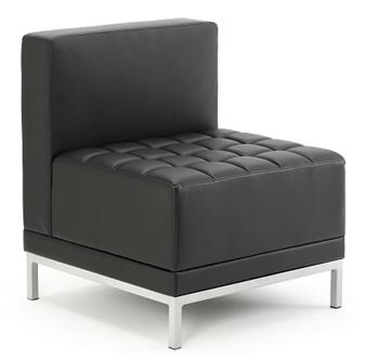 Infinity Modular Seating upholstered in a soft touch black button leather. The legs and base come in a stylish silver leg and sub frame. The modular system allows for versatile seating where a variety of configurations can be made using the 3 separate seats. This chairs can be used in reception areas, staffrooms, waiting rooms, or as a visitor seating. Ideal for reception areas in the school, clinic or in surgery waiting room areas. Quick delivery 3-5 working days.