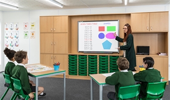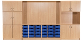 Learning Storage Wall - with locking or non-locking cupboard doors. Designed for teachers and their classrooms, these storage walls create an ordered room with efficient space for storage. The focal point of the wall is the centre area which will fit most interactive whiteboards - (whiteboard not included.) The central area measures 1250mm high x 2000mm wide and has a solid back to make sure your smartboards are secured safely. The storage wall contains 5 double cupboards, an open workstation space, and 2 tray units including 48 Gratnells trays in a choice of colours.