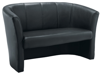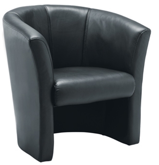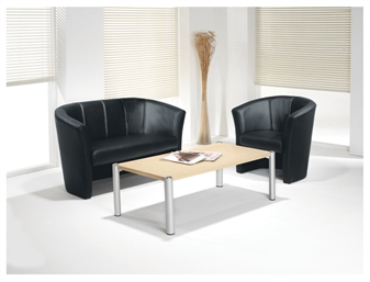 Leather-Look Tub Chairs, available for next day delivery. 1-seater tub armchair and 2-seater tub sofa, ideal for reception areas, staffrooms, waiting rooms, or as visitor chairs. The thick foam seats come in a resilient black leather-look upholstery. Accompanying coffee tables, square or rectangular, with beech tops and silver legs, are also available with this range. 5 year guarantee.
