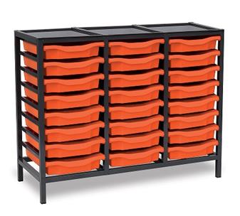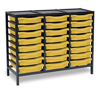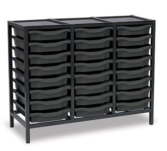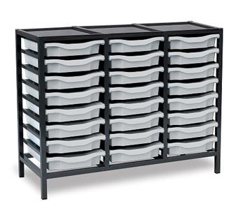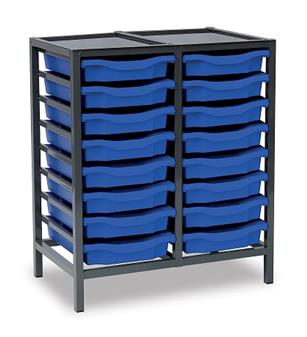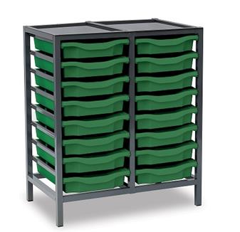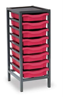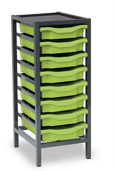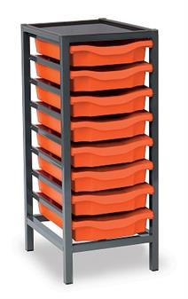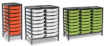 Low Charcoal Metal Frame Plastic Storage and available in 3 widths - single column with 8 trays, double column with 16 trays and triple column with 24 trays. The units are static with a 25 x 25mm ERW steel frame, fully welded with an epoxy powder coated finish and frames are fitted with heavy duty feet. These units are supplied with Monarch Trays in a variety of colours. The recessed tops are removable with open corners for easy cleaning. These units are suited to school, classroom, and other educational environments, and may also be used at home, in the office, or in workshop settings. Manufacturer 5 year guarantee.